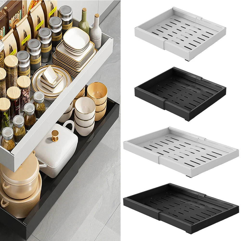 Rozsuwany organizer do szafki - wysuwane metalowe półki na prowadnicach, regulowane szuflady do przechowywania w kuchni, przesuwne półki do szafek.