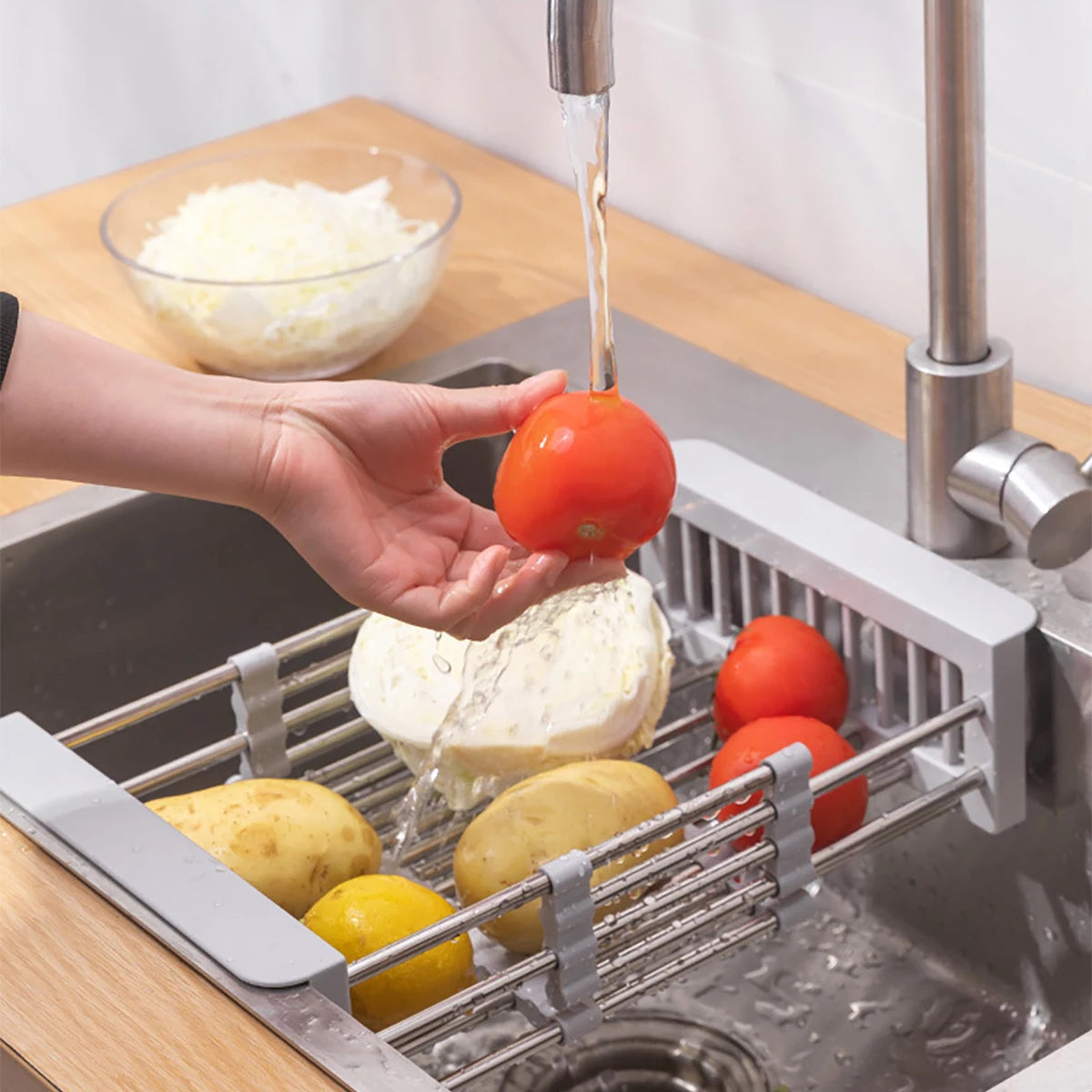 Rozsuwany ociekacz do zlewu - regulowany (28–47 cm), ze stali nierdzewnej i tworzywa PP, antypoślizgowy, o dużej pojemności, do warzyw i sztućców